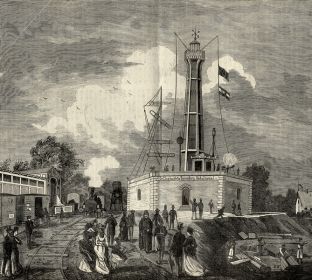 Am Westufer des Heustadelwassers, neben dem Marine-Pavillon präsentierte die Triester Seebehörde während der Weltausstellung eine vollständige Seeleuchte. Ihre drei Hauptbestandteile waren ein eiserner, mit einem Rundgang versehener Leuchtturm, ein optischer Telegraf (Semaphor) sowie ein Nebelhorn. Im Leuchtgebäude selbst waren die Kessel-, die Apparat- und die Schreibstube untergebracht.